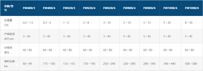分級機與旋風分離器、除塵器、引風機組成一套分級系統。物料在風機抽力作用下由分級機下端入料口隨上升氣流高速運動至分級區,在高速旋轉的分級渦輪產生的強大離心力作用下,使物料分離,符合粒徑要求的細顆粒通過分級輪葉片間隙進入旋風分離器或除塵器收集。粗顆粒夾帶部分細顆粒撞壁后速度消失,沿筒壁下降至二次風口處,經二次風的強烈淘洗作用,使粗細顆粒分離,細顆粒上升至分級區二次分級,粗顆粒下降至卸料口排出。