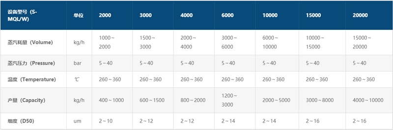 由常規氣流粉碎機升級而來,采用獨特的高溫機械密封技術、冷卻技術,采用高溫蒸汽作為粉碎動能介質,通過特殊設計的拉瓦爾噴嘴,帶動物料高速碰撞粉碎。粉碎后的物料進入強制渦流分級,合格物料進入保溫的收集系統收集,粗物料落入粉碎區繼續粉碎。整個過程在干法下完成。