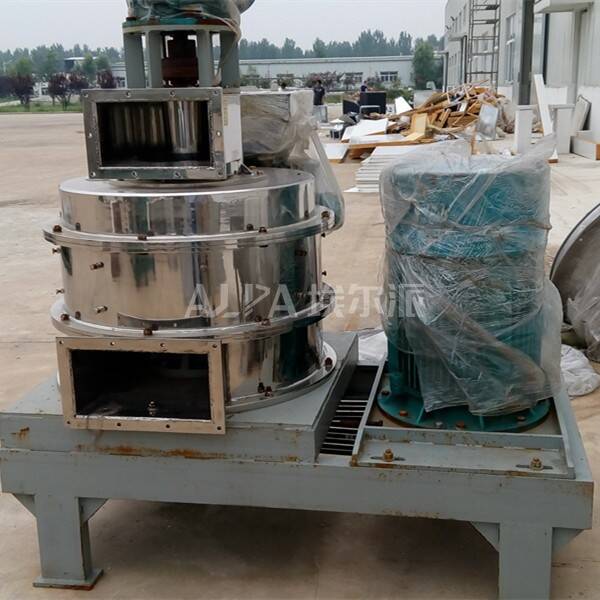 物料由加料系統均勻的送入粉碎室,受到高速旋轉的粉碎盤的強烈沖擊,同時受到離心力的作用,與粉碎齒圈發生碰撞,受到剪切、摩擦、碰撞等多種綜合力的作用,使物料粉碎,被粉碎的物料隨氣流運動到分級區,通過變頻調節的分級輪,對粗細物料進行分離,符合細度要求的產品隨氣流進入旋風收集器和除塵器收集,粗細料返回分級區二級粉碎。